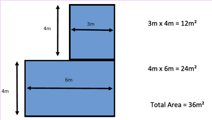 For non-rectangular areas you need to break down into smaller rectangles. For instance, an L-shaped surface can be broken into 2 smaller rectangles (see illustration). Add the 2 areas (12 + 24 = 36m²)